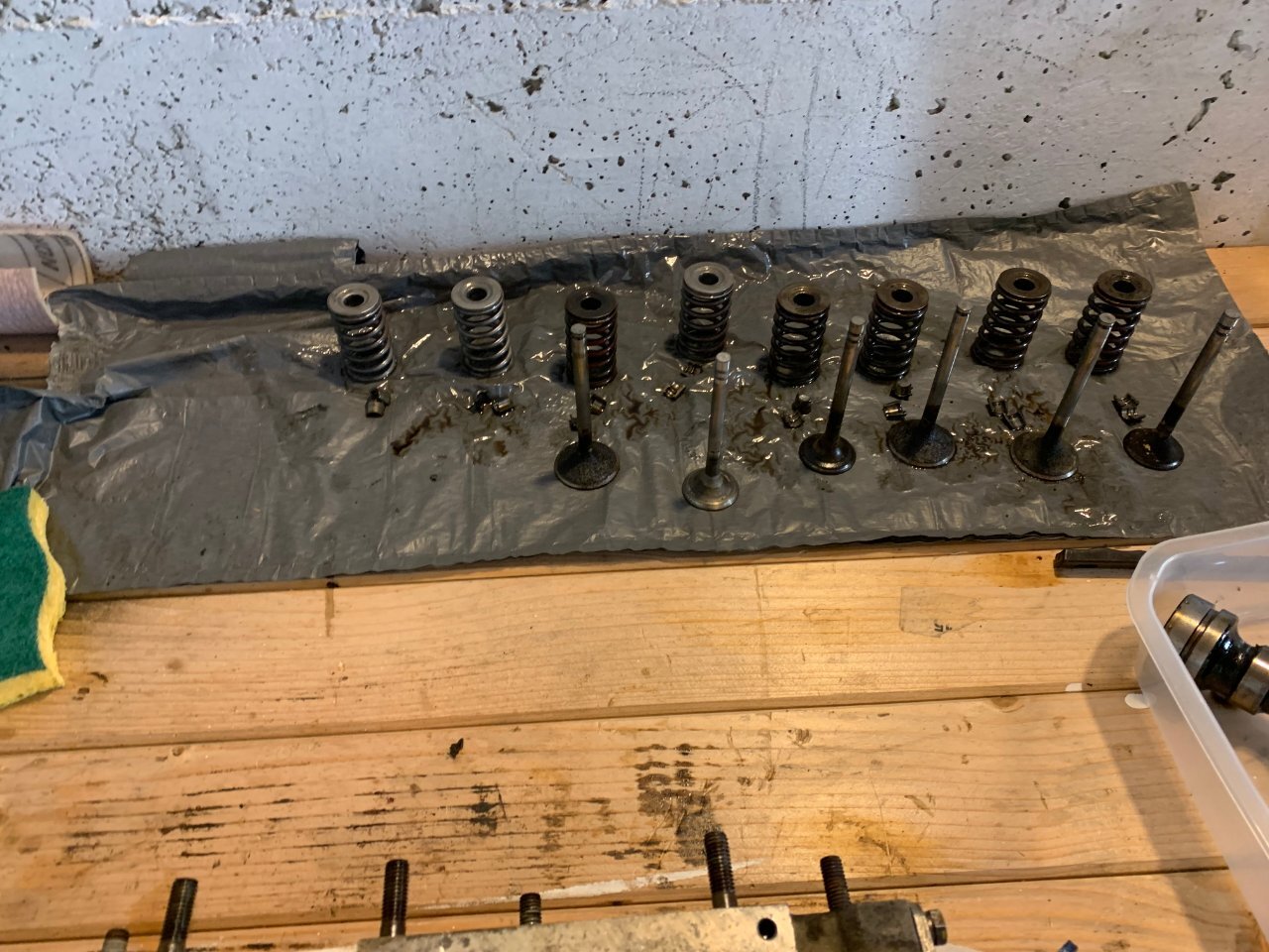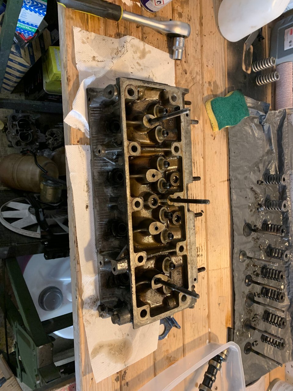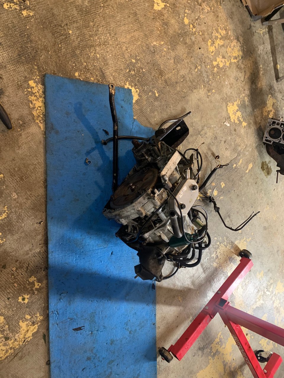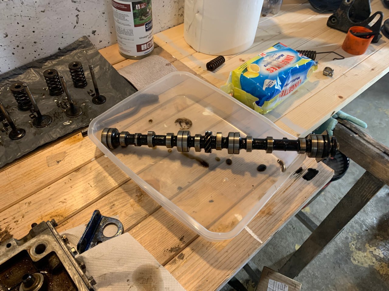 bonjour à tous, sa va être long je préviens bonne lecture . partie 1 : contexte (pour ceux qui aime la lecture épistolaire ) partie 2 : voiture ( pour ceux qui préfères les magazines ou il y as plus de photo que de lecture ) partie 3 : récap des travaux fait ou restant ( pour ceux qui préfère les sms rapide ) partie 1 : ayant pris un superbe de plaisir avec ma défunte automatique dite toto quelle repose en pièce (malheur d'avoir croisé un lampadaire qui as traversé sans regardé si si je vous le jure) je comptait en reprendre une un jour , tout s’accélère lorsque que malheur madame qui attend sagement à un feu suivis de 3 bagnole et tout derrière derrière une c3 qui a voulus joue aux quille... 8 bagnoles touché résultat train AR tordus sur la polo de madame voiture immobilisé en attendant qu'elle soit réparé. Donc besoin d'une voiture dans l'urgence madame ne conduisant que des boite auto je rassure elle as le permis manuelle mais je l'ai jamais vus passer une vitesse 😂la joie de passer le permis sur des voiture neuve et quand sa on arrive sur une autre voiture il y as pas les bip bip sa accélère pas tout seule quand on débraye ... donc mon dévolus ce porte sur une super 5 automatique dans le but de l'utilisé après que madame ait récupéré sa voiture je lui fait donc essayé la gt l'embrayage à pris 10mkm d'un coup 😆 non je rigole elle se démerde quand même un peu j'aime bien la taquiner les freins sa va l’accélérateur sa va madame est satisfaite mais le soucis que je voyais venir la direction et oui en roulant sa va mais à l’arrêt compliqué. donc gros doute sur la sup5 pour madame je regarde les Clio 1 bva ,106 ,saxo ,bof bof surtout si c'est pour la garder 6mois et la revendre et certaine n'avait pas la DA non PLUS jus qu’as je tombe sur une sup baccara BVA et la sa fait tilte ! les bacc ont tous la DA de série ! donc je cherche j’allais pas prendre celle vus en 1er 10 000 euros avec 200mkm je croit elle est toujours en vente a l'heure actuelle 🤭on m'as toujours dit faut croire en ses rêve ! bonne chance au vendeur . je tombe sur une annonce pas sur coincoin sur paru-vendus depuis 3 mois je tente, sa mord parfait le lendemain on vas la voir surprise 2eme main toute fraiche depuis janvier 2024 120 mkm historique Renault jusque 90m km carrosserie sans rouille même le dessous de la batterie la boite paraissait neuve (j'y reviens plus tard ) corrosion marque sur le CT (je l'as cherche encore a l'heure actuelle cette corrosion) a l’essai grosse surprise la sup a rien dans le sac mais rien de chez rien 90 pieds dans la tôle la boite répond super bien très souple équipé alarme serpistar vitrage complet d origine gravé non repeinte excepté les extension ou le vernis s’écaille donc on se décide de la prendre c'est la que ce qui devait bien ce passé a finit en ça c'est mal passé arrivé a la maison grosse fumé moteur début de feu le moteur qui semble rincé alors je souhaite chopper la réf du moteur et en retrouver surprise c'est pas un c2j dedans mais un c1g qui tournait avec le double corps, facture de la vidange 5w40 dedans 100km depuis la vidange de faite qui ont suffit a décoller les impureté et résidus dans le bloc a bouché la crépine d'huile et les segment rincé retour de compression dans l'huile voila le résultat une belle merde qui commence bien. partie 2 la sup ! super 5 baccara BVA kilométrage 128 000 km état corrosion RAS carrosserie quelque poc et rayure voiture de mamie oblige kit extension a repeindre niveaux travaux effectué dessus il as fallu déposer l'ancien moteur et nettoyer la baie moteur la belle au chaud prêt a se voir opérer (le véhicule derrière est un iltis183 de 81) dépose du groupe motopropulseur ensuite on attaque la remise en état du c2j plutot en très bon état les stries dans les chemises sont encore bien présente et il compressait plus que bien donc mon travail vas plus ce concentré sur la culasse kilométrage annonce 120mkm dépose des soupape contrôle des guides trop de jeu a échappement dépose de l'arbre à came et de la chaine préparation du bac à ultrason petite démo sur la culasse pour montrer la différence seul regret du bac a ultrason ? j'aurais dus le prendre plus grand XD. on en profite pendant ce temps on clean la boite toto et j'essaye de vidanger le convertisseur à part donner une raison pour que madame se foute de moi en me voyant secouer le bestiau dans tout les sens comme une macarena j'ai récupéré à peine un demi verre donc je remet le max d'huile propre dedans et de retour sur la bva en regardant la BVA celle ci est de 1993 donc déjà changé parfait la crépine était aussi d'origine un peu de limaille mais pas bcp. je m’aperçois que mon échangeur est en inox un bon point je souffle dedans sa passe difficilement dans un sens mieux dans l'autre après recherche je me conforte à me dire que c'est normal l'histoire du sens tout ci tout ça on verras la suite après ! j'en profite nettoyage de la baie moteur pour enlever le gras on c'est tous pourquoi les berceaux des sup5 ne rouille pas j'en profite accélération du régime ne marchais pas le câble est coupé a ras du contacteur de pression celui étant introuvable j'essaye de ressouder le fil tant bien que mal plus petite thermo assez rigide pour le protéger suspens au remontage d’ailleurs sacré histoire ce système de double courroie avec le petit galet de tension on vois que c'est dus j'essaye de trouver comment adapter sa à l’époque j'en profite le roulement semble dur allez hop on le change pas de photo du galet oublis de ma part on en profite on check la pompe a huile c'est neuf ultrason et sa repars ! peinture du cache en thermolaquage ainsi que le support de filtre a essence, le bloc moteur peinture la bombe un truc a 6 euros de chez carter truc sa tiens sa tiens sa tiens pas sans regret on laisse sécher sa et demain on remonte ! la distri remonté et caler les c