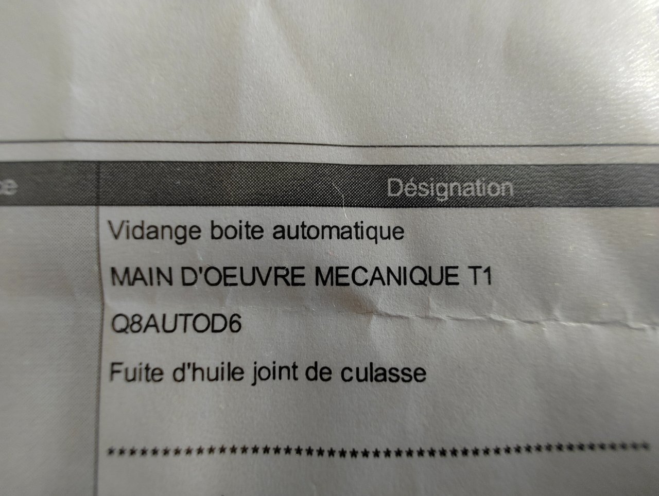 Je viens de déposer la voiture chez un autre garagiste spécialisé anciennes (conseillé par celui qui m'a fait la vidange de la BVA). Sur le chemin, arrivé quasiment chez lui, voyant de boîte + patinage (en gros comme si je tirais à fond dessus). Sur le parking je tente une marche arrière : nickel. Neutre : nickel. J'éteins, je rallume, aucun souci le voyant a disparu. On verra le comportement ce soir. J'ai payé 123€ la vidange de boîte (60 de main d'oeuvre + le reste en fournitures et TVA), je poste en pièce-jointe la photo du descriptif.