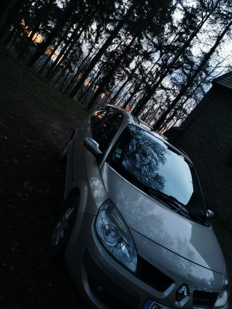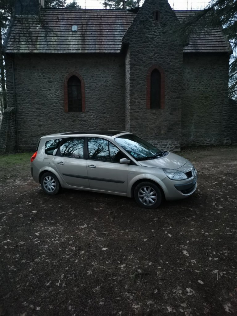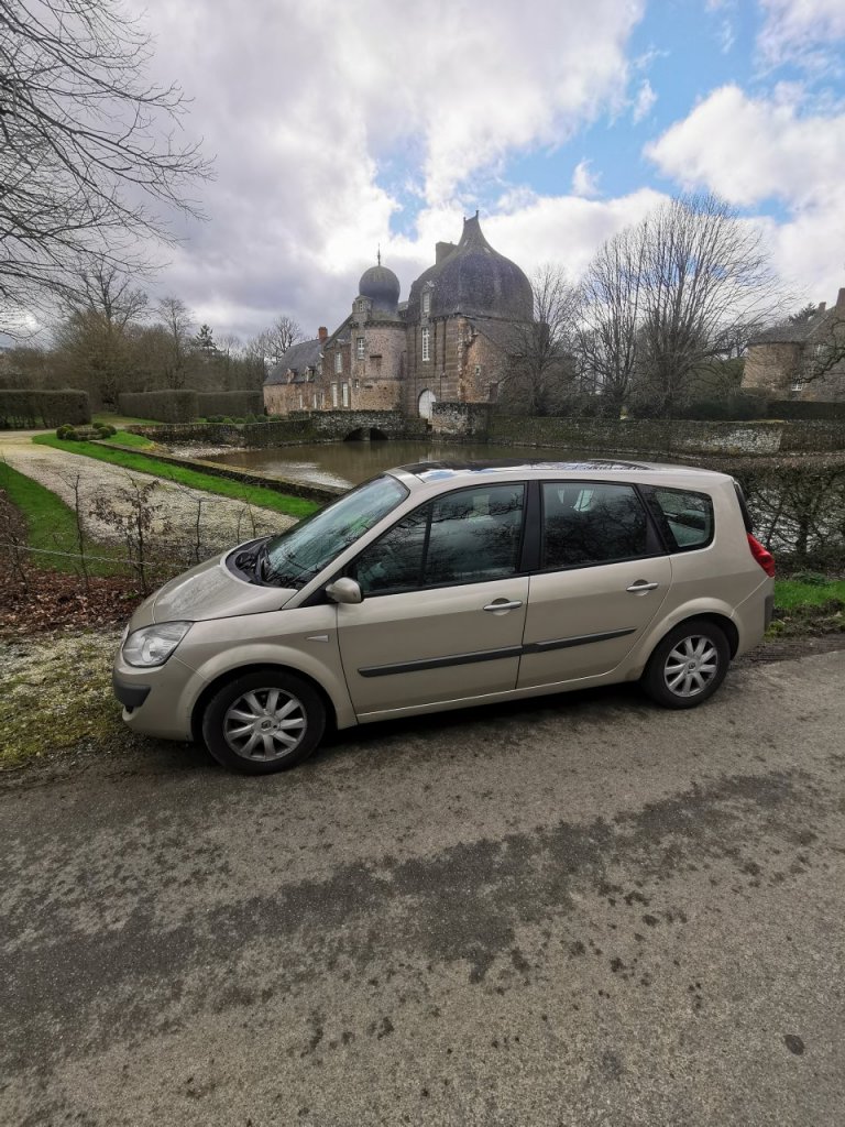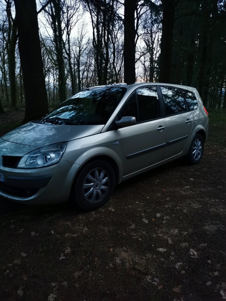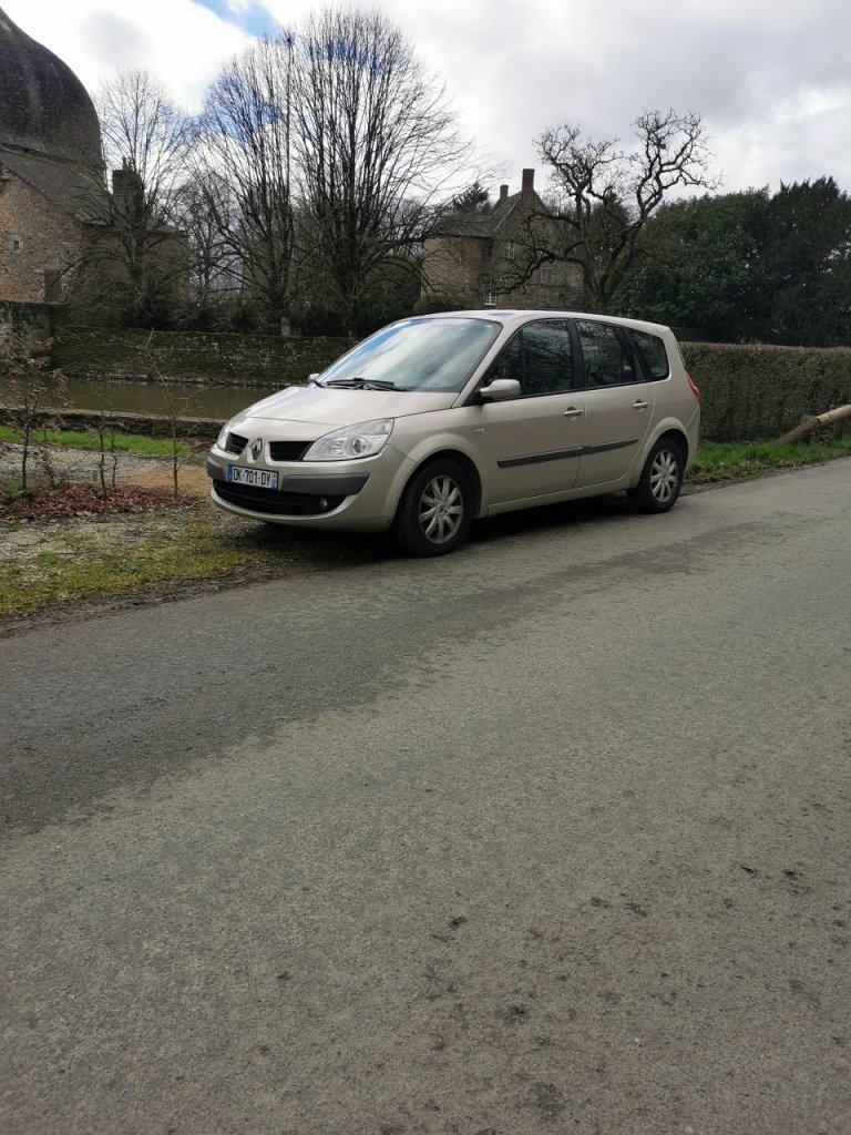 Voila, depuis plus d'un an j'avais acquis une Clio 1 ph2 1.9D pour me servir de daily. Mais en Janvier je travaillais sur la RP en partant à la semaine, et la route avec ce petit vaux asthmatique et le faîte qu'il avait tendance à bouffer du ldr si je le sollicitais de trop, me disais que je devrais me résoudre à changer de véhicule. Et le lundi 20 Janvier en me rendant au taf l'ouvrier avec sa camionnette plateau ne ma pas vu arrêté. Et bim, parchoc ar hayon et sur tout la traverse entre feu qui a reculé un peu genre 10mm. Donc il m'a fallu partir à la recherche de la suivante plus confortable bonne routière, et tant qu'à faire prendre plus grand si possible, le c3 Picasso de Mme ayant pas loin de 250000kms et fini par être juste à 4 avec les bagages dans le coffre, afin partout même... Les Espaces 3 me plaisait bien mais difficile à trouver en bonne état et dans mon budget. Reste les Grand Scénic, qui rentrait dans mes critères. Je lança donc mon dévolu sur les modèle 2L ess pour le passer à l’éthanol, et j’espérais trouver avec le toit ouvrant panoramique. Après déception avec un vendeur particulier qui ne me répondait plus, j'ai fini par ne chercher qu'en garage. J'avais trouvé un modèle ph1 de 2007 gris beige, avec le toit ouvrant panoramique, en 2L ess boite auto, et 154000 kms et en 7 places, j'avoue quele 7 places n'avait pas vraiment l'utilité mais bon pour le "au cas où". RDV prit pour aller le voir, et là, la carrosserie avait vraiment de gros défauts, et surtout une distri pas à jour... Au final je ne l'ai même pas essayé, je voilà bien à avoir traversé toutes la RP pour rien... Mais heureusement il en avait un second, Grand Scénic ph2 de 2008 en 2L mais DCI 150ch, avec le fameux M9R sans courroie de distri. Même tarif beige poivré int expression si je ne me plante pas 168000kms. Et après essais j'ai signé le bon de commande, deux jours après je prenais la route de chez moi en Mayenne à son bord. Après 2000kms de fais en 15 jours je l'adore vraiment, j'ai une moyenne de conso entre 6.9L et 7.1L suivant la route et la bvm6v est vraiment plaisante. Allé je fini avec quelques photos de mon petit gros 😋 Chez le vendeur, un petit négocient du 95 super sympa d'ailleurs.