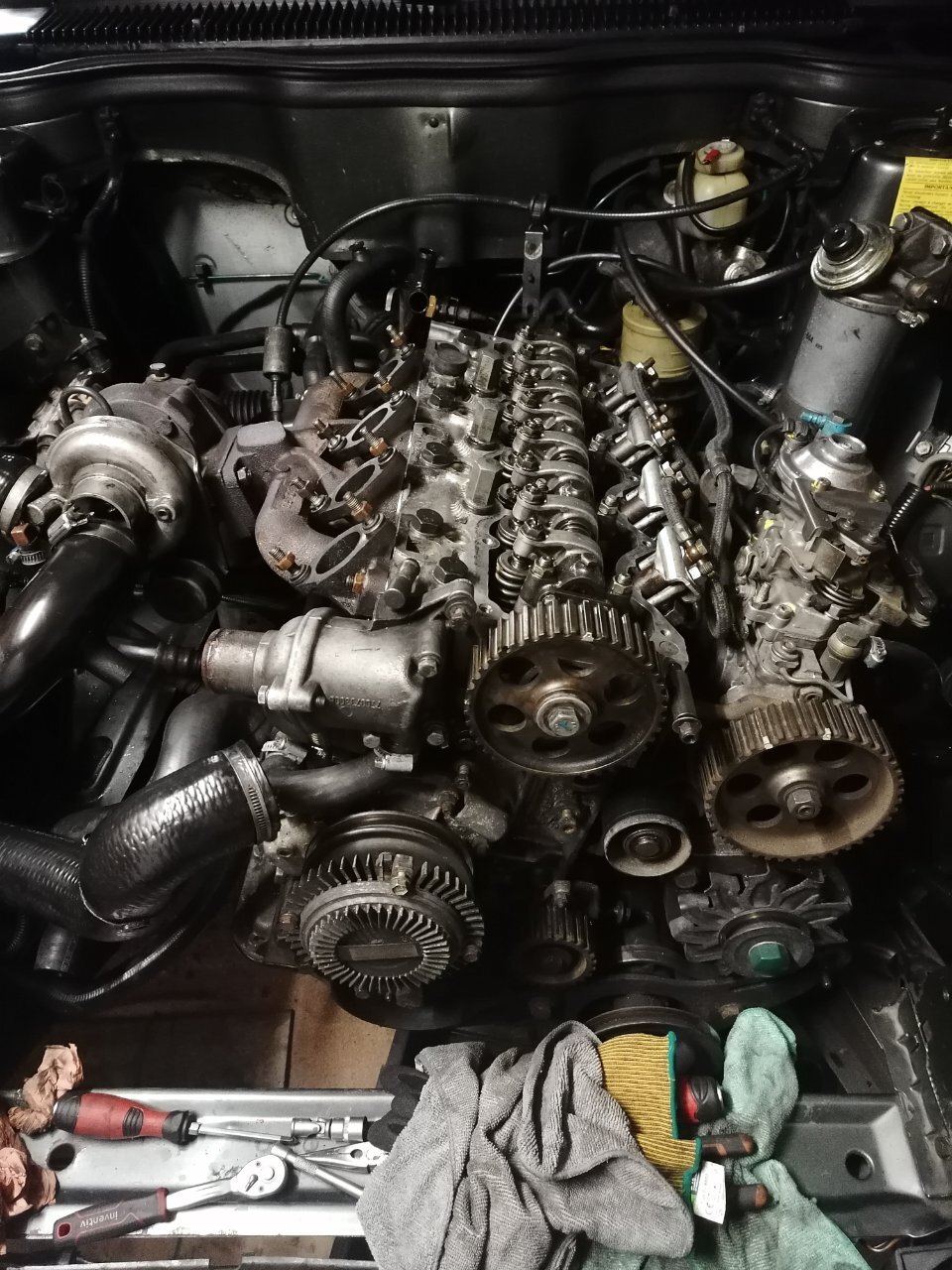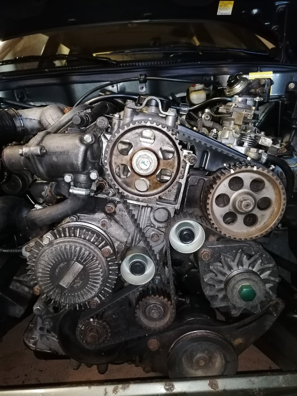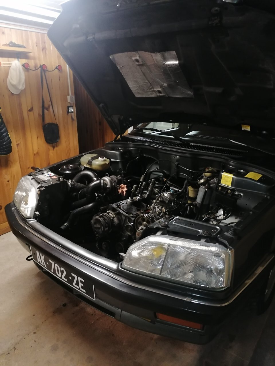 Salut à tous ! ☺️ Bon, la 25 est sur la table d'opération depuis samedi. Je vous explique... En février, je m'aperçois que je dois rapidement changer une durit de pompe à eau. Cette durit était vieille, sèche et prête à céder. 30 ans et 520000 kilomètres dans les pattes quand-même. Le jour même, sur autoroute cette durit pète. Je la démonte et je vois qu'elle a lâchée de vieillesse. Et non à cause de la pression. Donc je suis sur autoroute, je vois un panache de fumée derrière moi. Mon aiguille de température qui grimpe en flèche, sans jamais atteindre la zone rouge. Je sors de l'autoroute, j'arrête de suite le moulin et j'ouvre le capot. Tout le LDR s'est échappé par la durit éventrée. J'étais à 4 kilomètres de mon garagiste habituel. J'ai pris le risque d'y aller en speed, en regardant de près ma jauge de température. Elle n'a jamais atteint le rouge. Visco coupleur enclenché en permanence. Tu m'étonnes ! Vla pas la chaleur ! Je change la durit, je remets lle LDR à niveau, mega purge du circuit, et roule. Sauf que... Depuis elle dégueule le LDR UNIQUEMENT sur autoroute à forte charge. Que sur autoroute !! Tu roules en ville, il se passera jamais rien. Tu roules à 100/110 tranquille, il se passe rien. J'ai fais 3 test CO2. Non concluants. Je remplace mon calorstat par un tout neuf de chez Renault. Un vernet. Ça n'a rien changé, ça monte en pression sur autoroute. Durit de radiateur bien chaude en haut, mais froide en bas. Meme après 40 bornes pour aller au taf. Plus de chauffage ou presque. Me dis: à mon avis le joint de culasse a pris cher avec la surchauffe. Donc je procede à sa dépose. La suite en photos 😉
