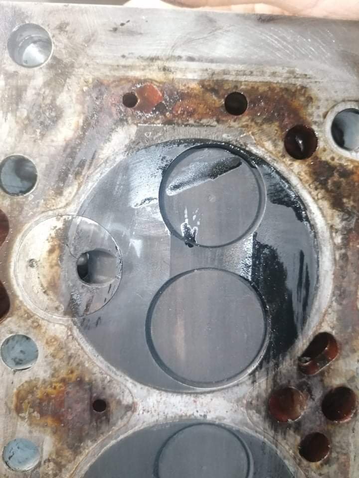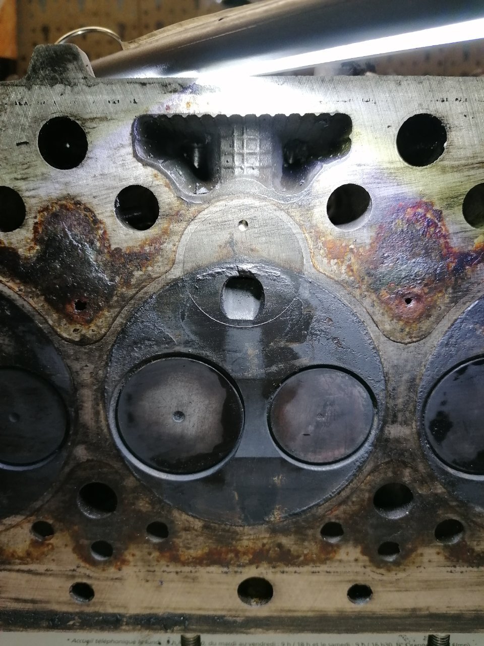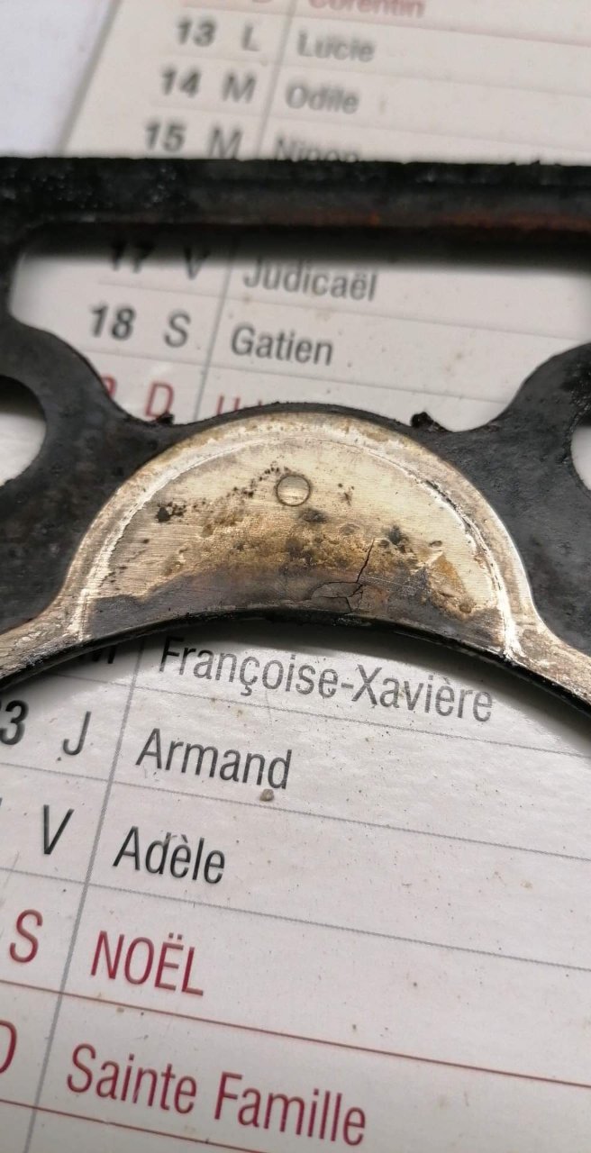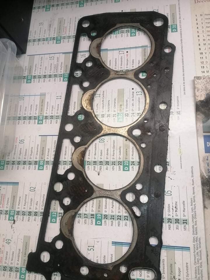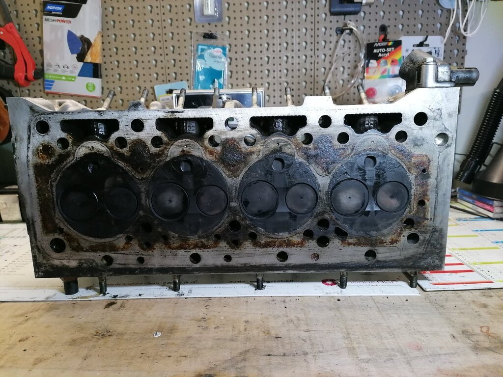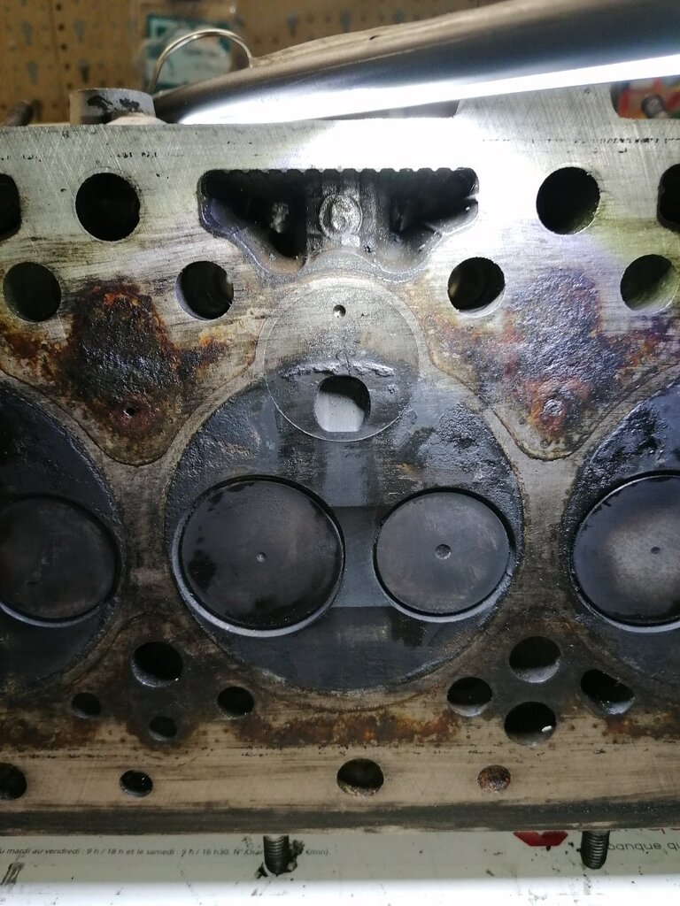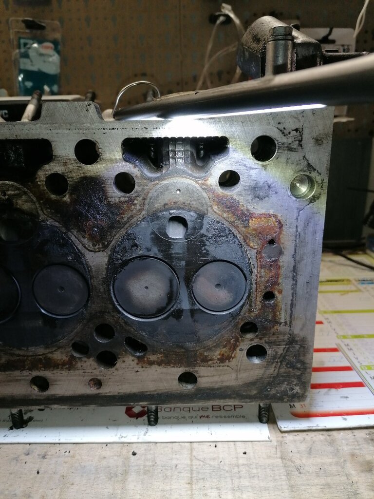Regardes au niveau des pré chambres 👀😅 Je m'embête même pas à la contrôler ! La voiture a surchauffée à mort. J'ai roulé sans eau 4 bornes. La culasse est fendue entre les soupapes. Et doit être bien tordue. Parce que j'ai essayé de contrôler la planéité. J'ai pris une règle métal et un jeu de cales. Le maximum autorisé c'est 0.05. Je passe par endroits une cale de 0.15 👀 Donc j'en ai acheté une d'occasion en bien meilleur état. Demain elle part à l'épreuve.